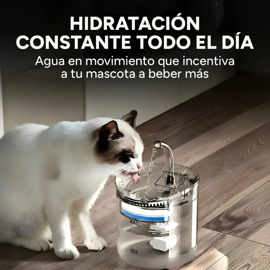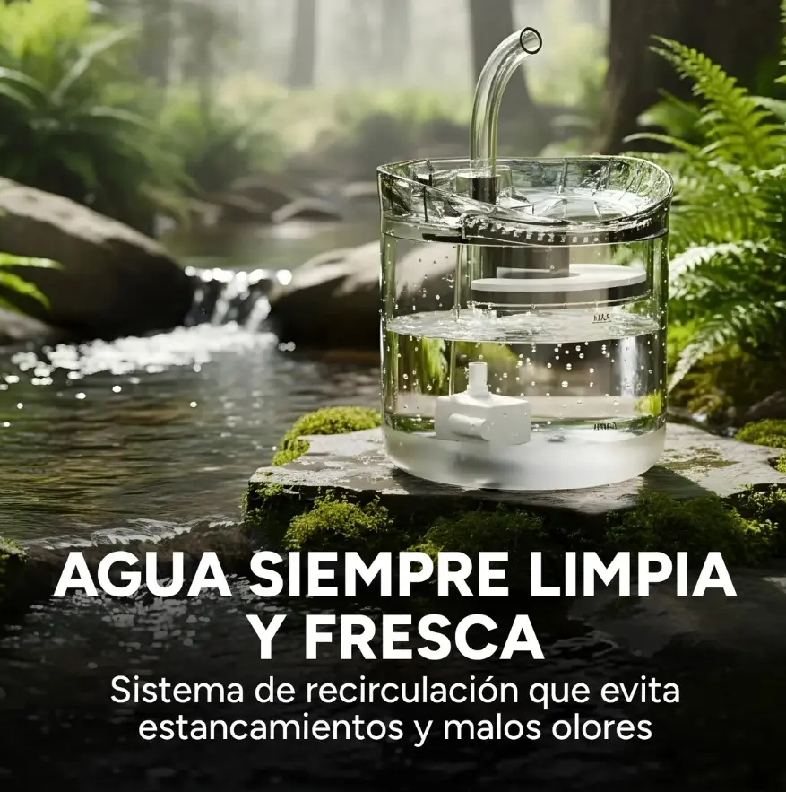 El agua estancada acumula polvo, pelo y bacterias en pocas horas. Tu mascota detecta esto y deja de tomar agua suficiente.