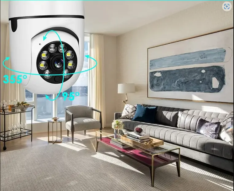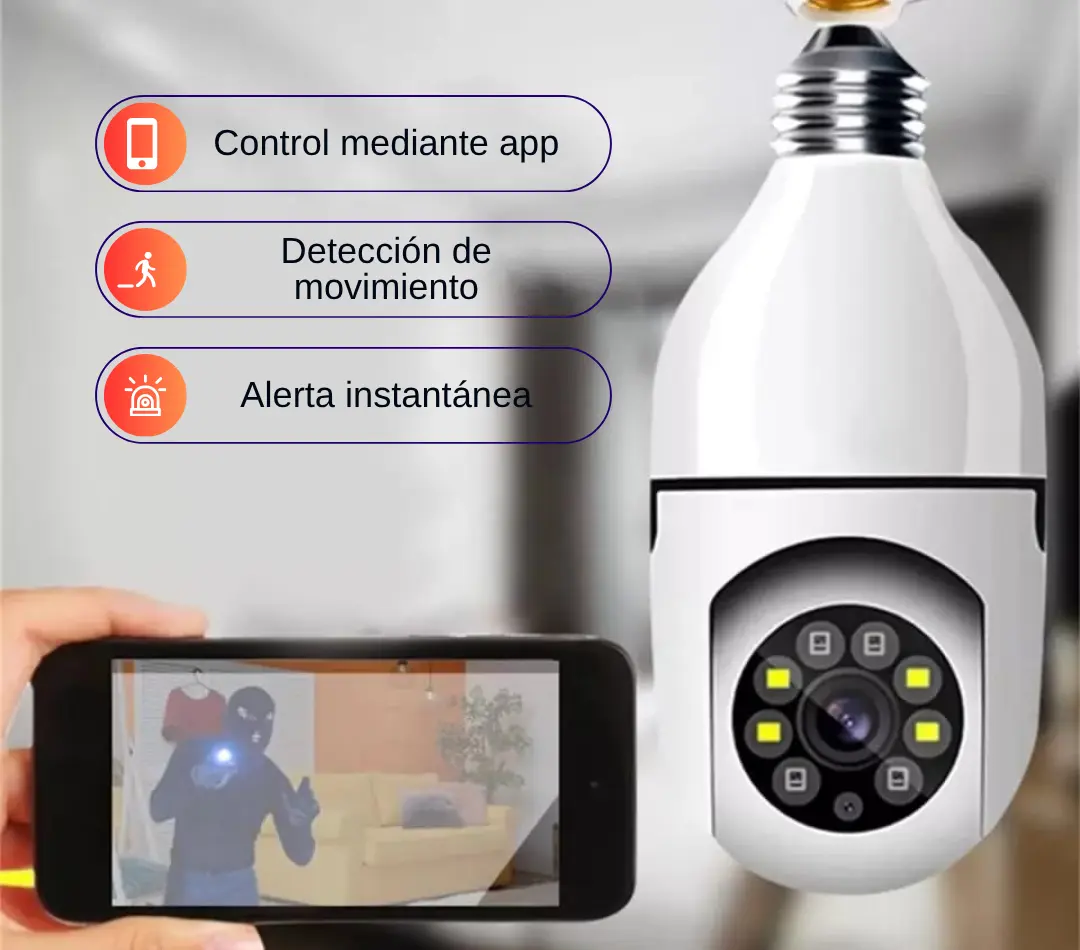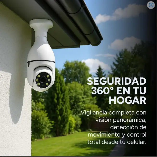 La Cámara Bombilla 360° combina seguridad y discreción en un solo dispositivo. Solo la enroscas como una bombilla común, la conectás al WiFi, y en segundos podes ver todo en 360°